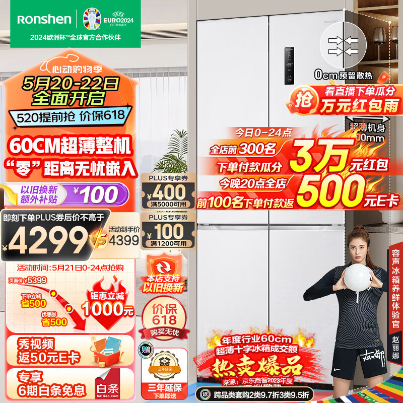 容声(Ronshen)60cm薄503升平嵌十字对开四开门超薄嵌入式冰箱家用变频一级能效大容量白色底部散热BCD-503WD1FPQ价格:5398.00元!