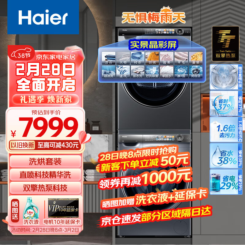海尔【洗烘套装】10公斤大容量洗烘组合 超薄大筒径精华洗 智能投放洗衣机+晶彩屏双擎热泵干衣机价格:8999.00元!