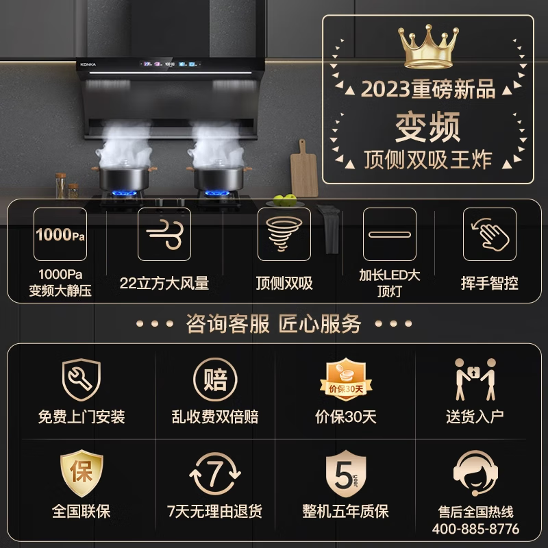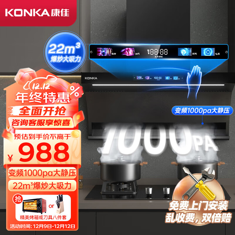 康佳(KONKA)抽油烟机 顶侧双吸7字型 变频1000pa大静压 22m3/min爆炒大吸力 挥手自清洗彩屏CXW-288-KL79B价格:988.00元!