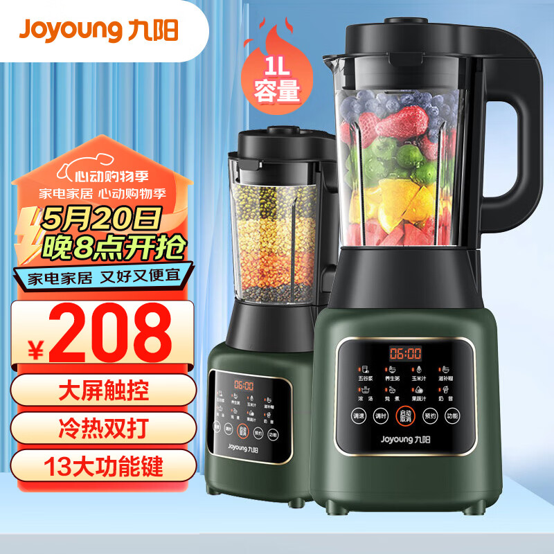 九阳(Joyoung)破壁机 多功能家用小型预约加热破壁料理机 榨汁机 豆浆机 辅食机 1L精巧小容量 复古绿L12-P127价格:208.00元!