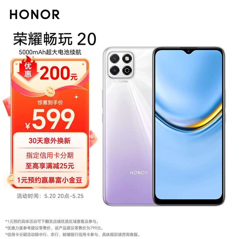 荣耀畅玩20 5000mAh超大电池续航 6.5英寸大屏 莱茵护眼 老人 4GB+128GB 钛空银价格:599.00元!
