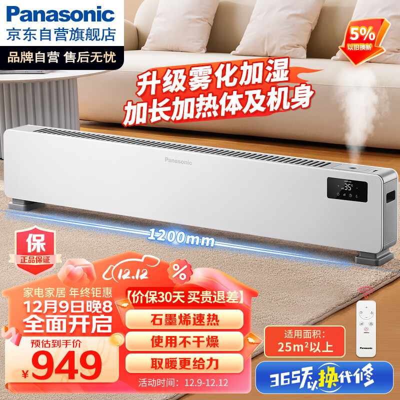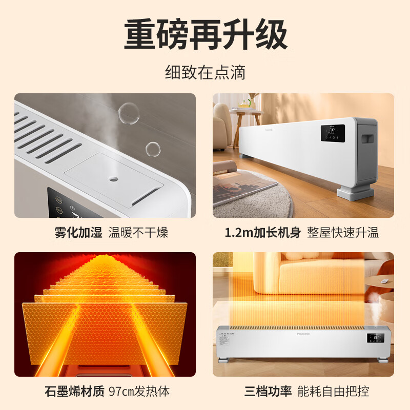 松下(Panasonic)踢脚线取暖器石墨烯家用轻音加湿电暖器居浴两用电暖气片无光速热移动地暖 DS-AK2232CW价格:1199.00元!