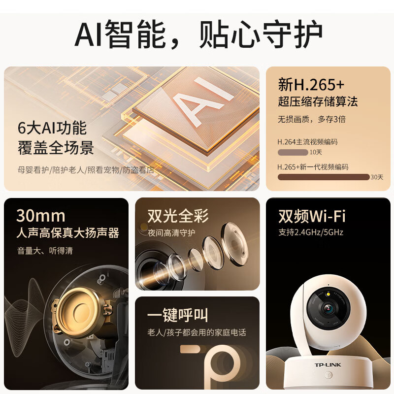 TP-link 400万双频摄像头家用监控器360全景无线家庭室内可对话手机远程网络门口高清 IPC44AW 全彩 Plus价格:279.00元!