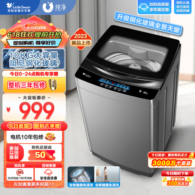 小天鹅(LittleSwan)波轮洗衣机全自动 10公斤大容量 升级钢化玻璃门盖 免清洗不脏桶 以旧换新TB100V288E价格:999.00元!