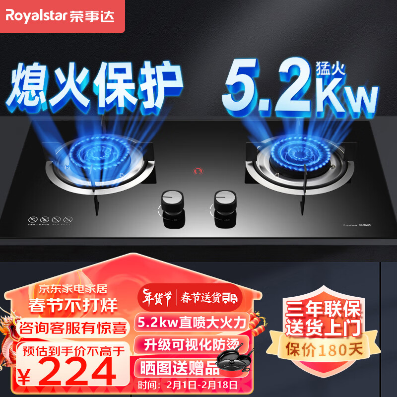 荣事达(Royalstar)燃气灶天然气双灶嵌入式家用5.2KW火力玻璃熄火保护管道气猛火灶具 RSD-R202 天然气价格:224.00元!