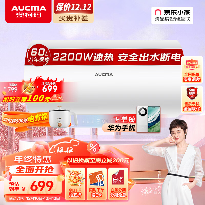 澳柯玛(AUCMA)电热水器 60升2200W家用速热水器 京东小家智能生态 触控彩屏智能预约 高温自清洁FCD-60W309D价格:799.00元!