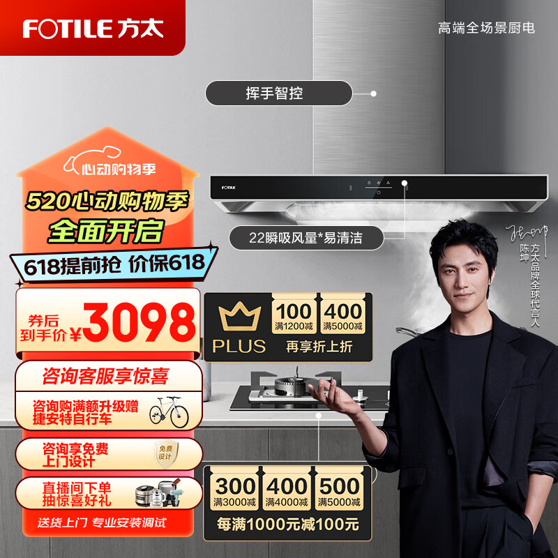 方太抽吸油烟机灶具套装 欧式顶吸排烟机燃气灶套餐 家用 22瞬吸风量挥手智控EMC5A+02-TH33B天然气价格:3398.00元!