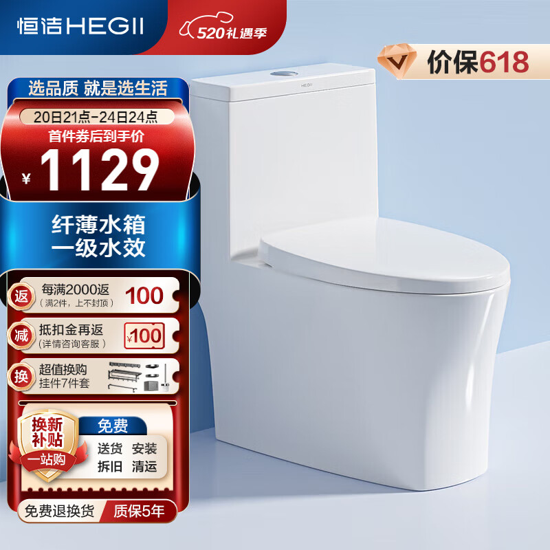 恒洁(HEGII)马桶507 三重瞬冲全包设计 轻薄节水坐便器HC0507PT-305价格:1389.00元!