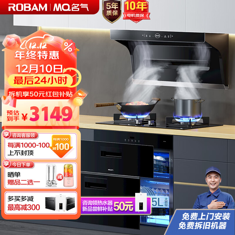 名气(MQ)老板抽油烟机烟灶套装7字型23吸力风量吸油烟机燃气灶消毒柜家用烟灶消三件套5505A+6312BT+x101价格:3149.00元!