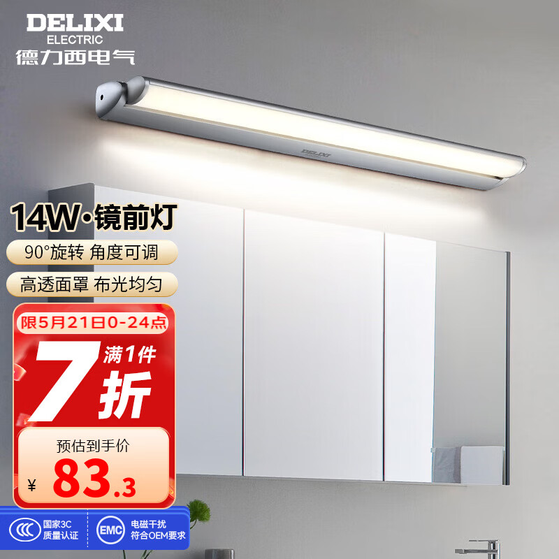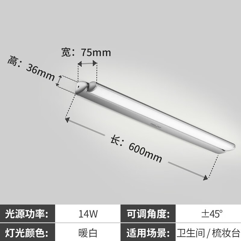德力西(DELIXI)LED镜前灯卫生间镜柜灯浴室柜灯水防雾壁灯防化妆卫生间灯 【14W暖白光】长度60厘米价格:119.00元!