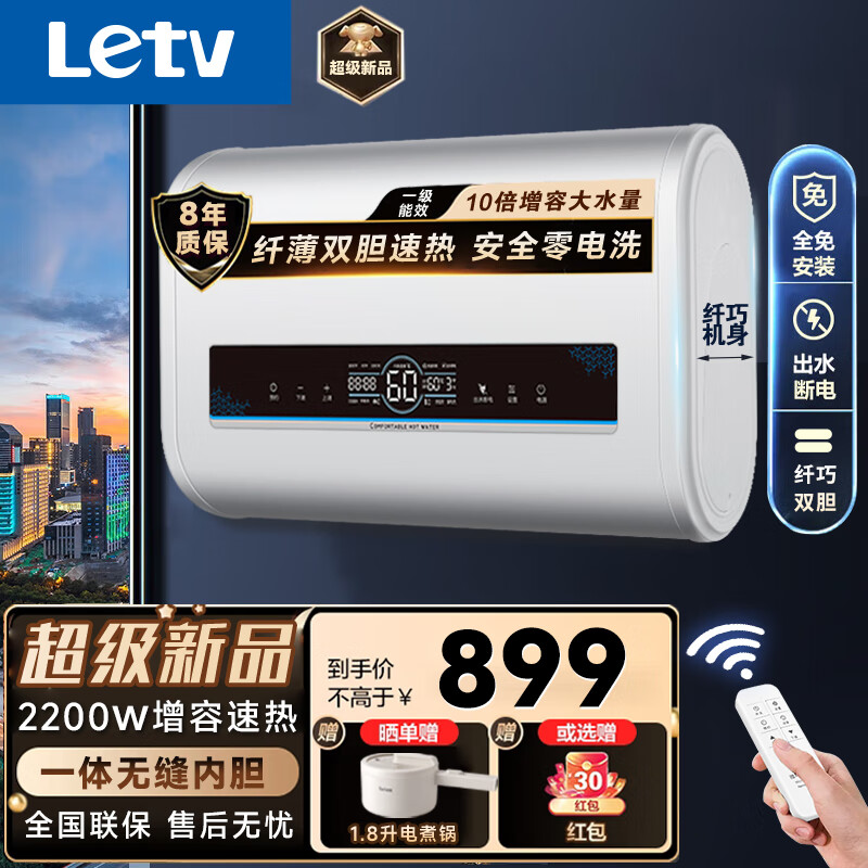 乐视储水式家用热水器电热水器80升扁桶2200W一级能效10倍增容洗澡DSZF-D05-80价格:899.00元!