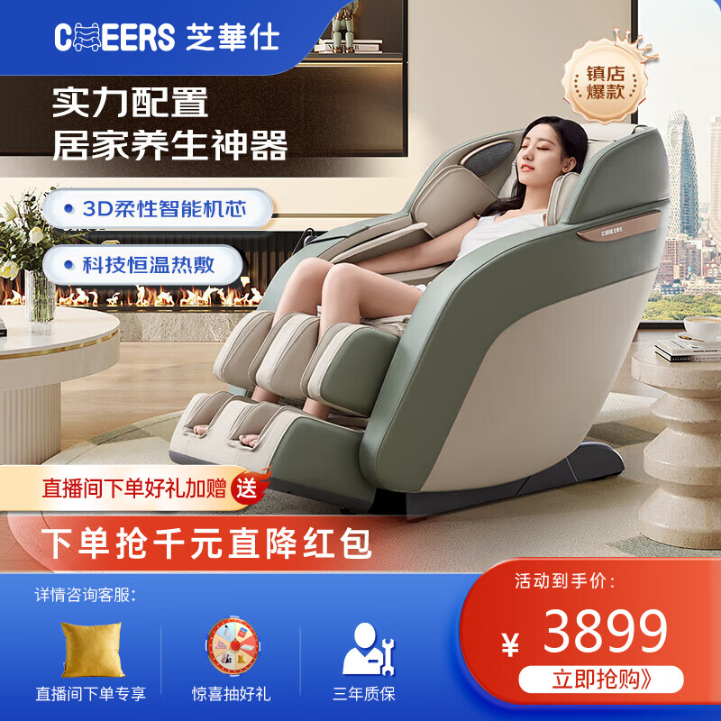 芝华仕(CHEERS)头等舱按摩椅全自动太空舱全身智能电动按摩椅家用梦享实力派 MZ630 苹果绿-现货发货价格:3899.00元!
