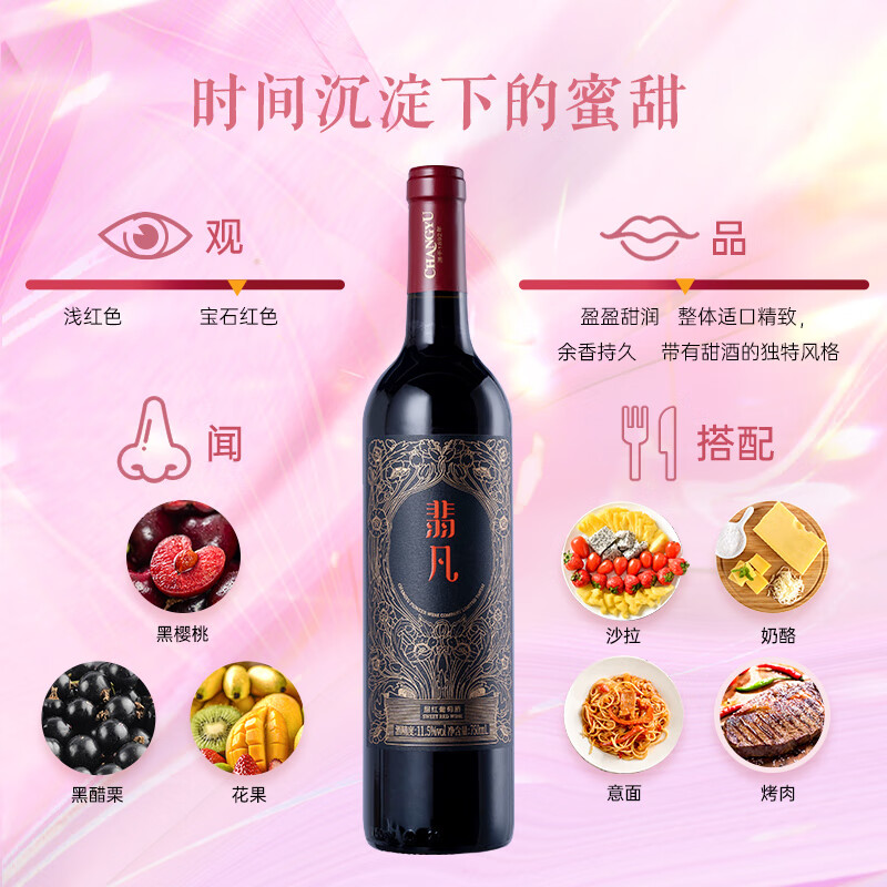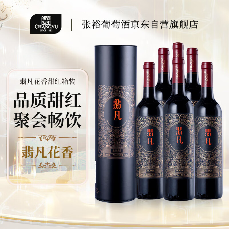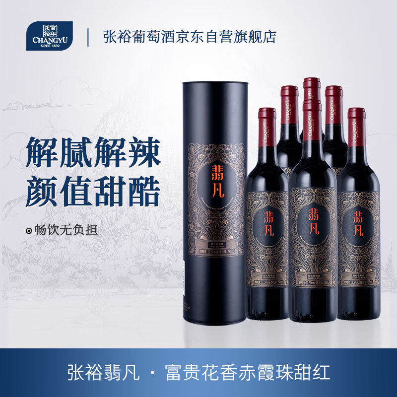 张裕 翡凡富贵花香赤霞珠甜红葡萄酒750ml*6瓶整箱圆筒装国产红酒送礼价格:664.00元!