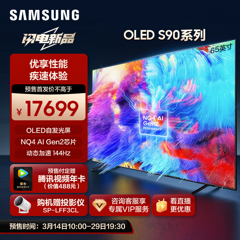 三星(SAMSUNG)65S90D 65英寸 OLED量子点电视 超薄4K 144Hz 超薄屏 无开机广告 65S90Z升级款QA65S90DAJXXZ价格:17699.00元!