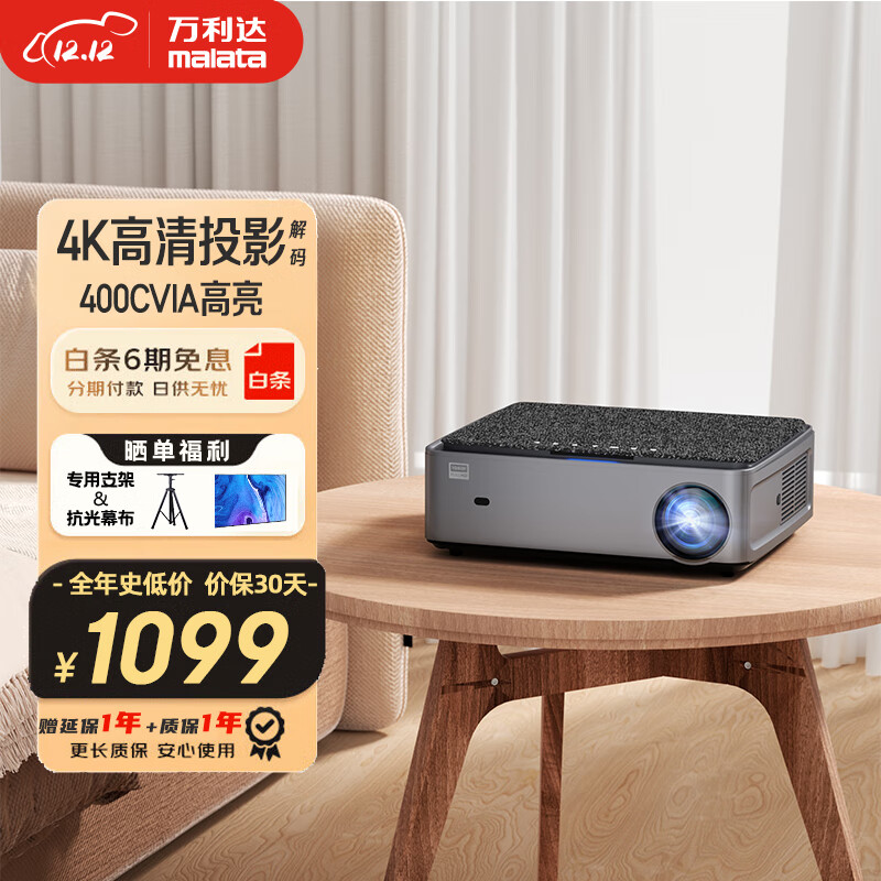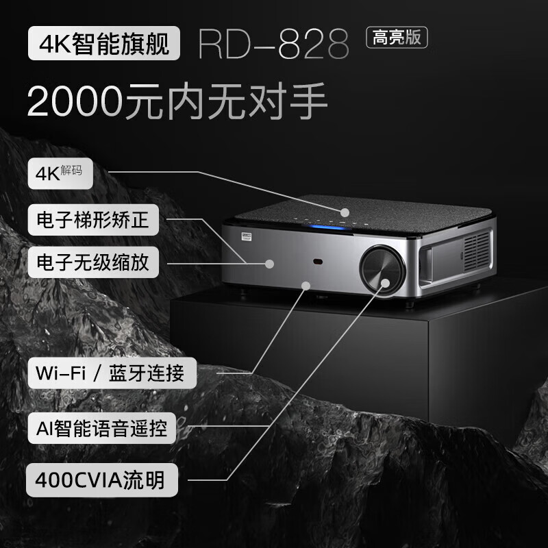 万利达(malata)RD-828高亮版 投影仪家用办公投影机(硬解4K分辨率 智能系统 AI语音 手机投屏 卧室投影)价格:1799.00元!