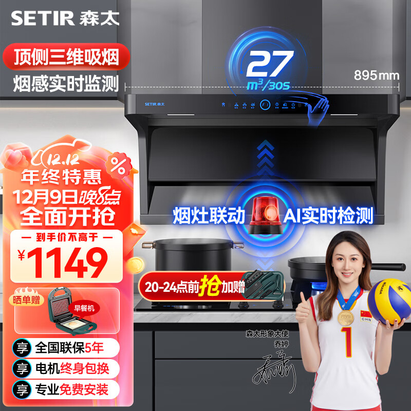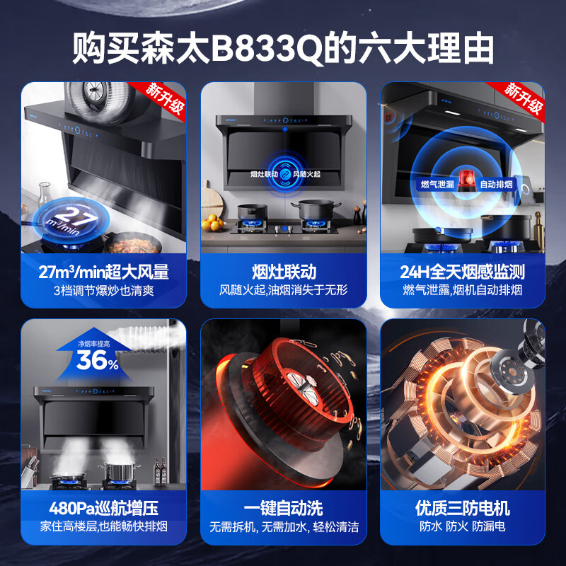 森太(SETIR)顶侧双吸油烟机 7字型抽油烟机大吸力烟灶联动厨房家用可开合自动清洗吸油烟机CXW-320-B833Q价格:1149.00元!