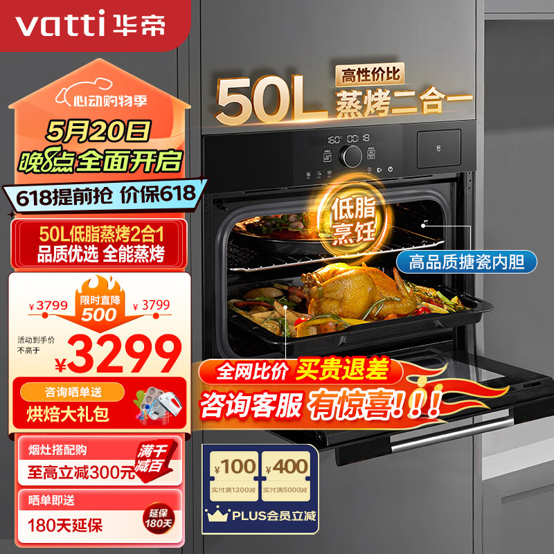 华帝(VATTI)蒸烤箱一体机嵌入式 蒸箱烤箱家用 50L大容量 智能app预约 搪瓷内胆 JYQ50-i23011价格:3599.00元!