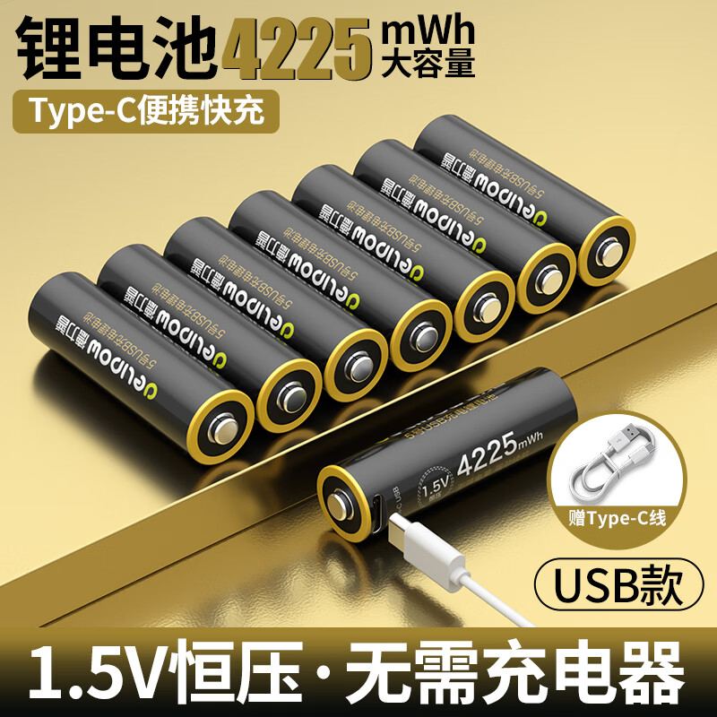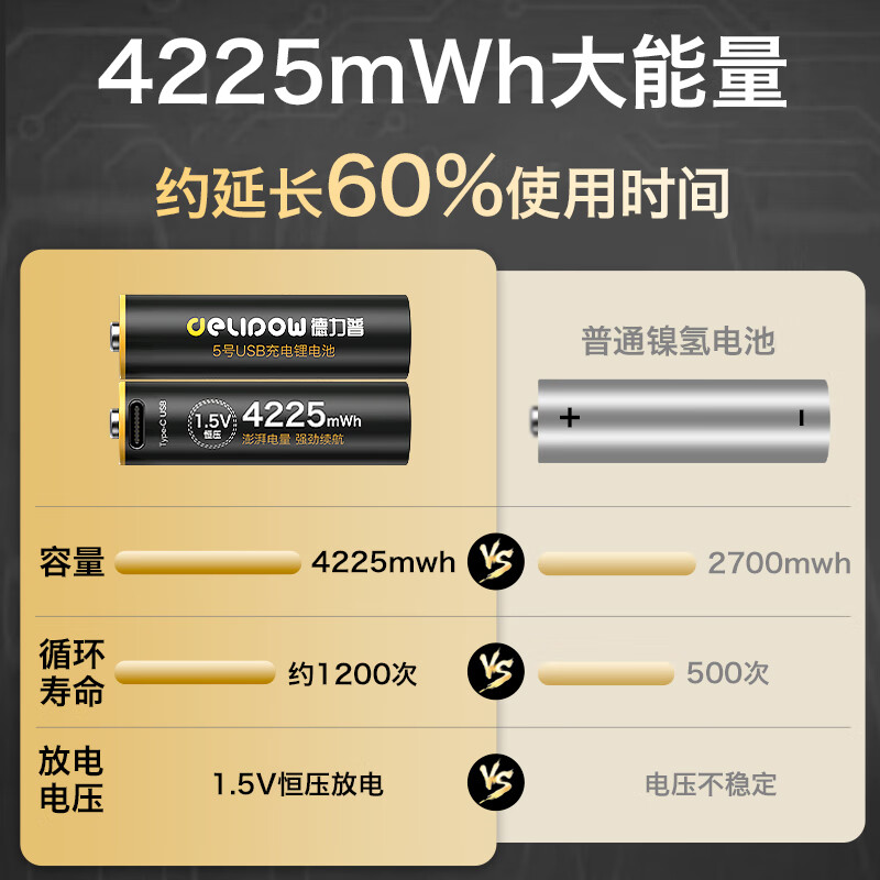 德力普(Delipow)USB充电电池 5号锂电池4225mWh大容量1.5v恒压配Type-C快充线 适用血压仪/电子锁/鼠标/游戏手柄等价格:221.50元!