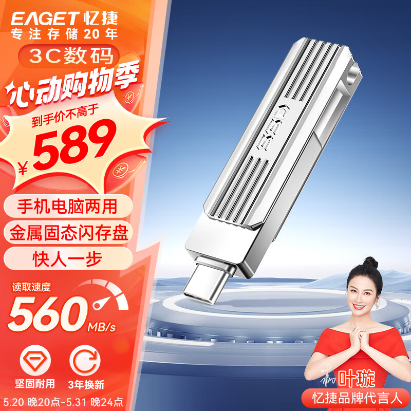忆捷(EAGET)1TB USB3.2 Gen2 Type-C双接口 SU22高速固态U盘大容量读速560MB/s手机电脑两用办公优盘移动价格:589.00元!
