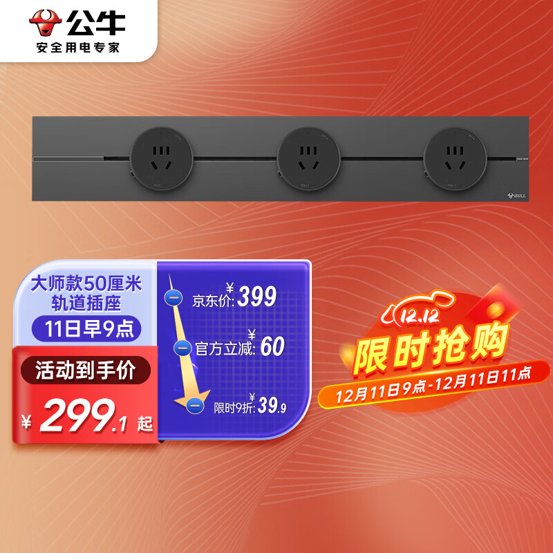 公牛(BULL)明装 轨道插座 大师轻薄款 可移动墙壁插座壁挂式滑轨插座 免打孔 50厘米轨道+3个五孔 墨云灰价格:399.00元!