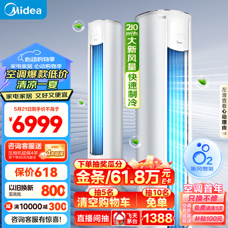 美的(Midea)2匹新风空调新风量210m3/h焕新风新一级变频冷暖客厅立式柜机KFR-51LW/N8MKA1A价格:6999.00元!