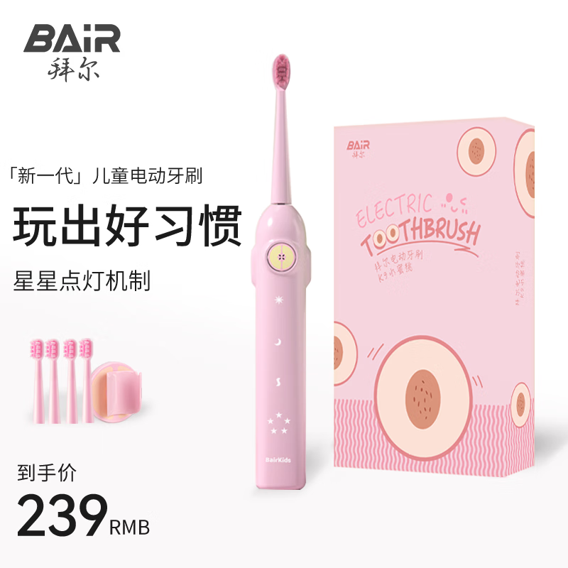 拜尔(BAIR) K9 儿童电动牙刷充电式小孩3-6-10-12-16岁宝宝软毛全自动声波电动牙刷小学生青少年送孩子礼物 “桃”你喜欢价格:238.00元!