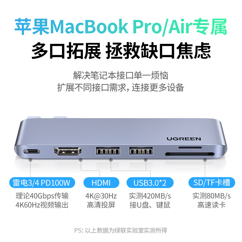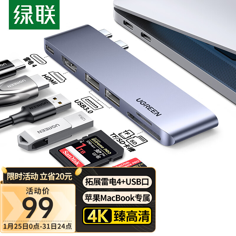 绿联Type-C扩展坞苹果直插式拓展坞USB3.0分线器MacBookPro/Air笔记本电脑SD/TF读卡雷电3/4HDMI转换器价格:99.00元!