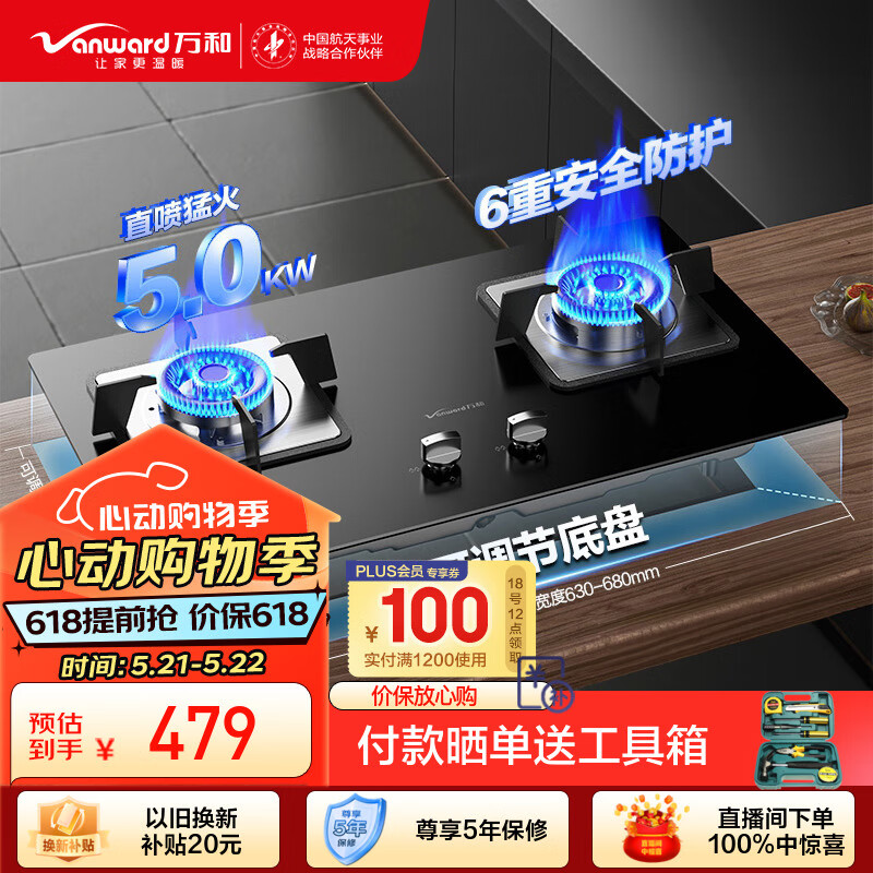 万和(Vanward)燃气灶5.0kW大火力嵌入式台式两用灶具家用双灶 免改孔可调节底盘灶具 JZT-B7L51(天然气)价格:478.00元!