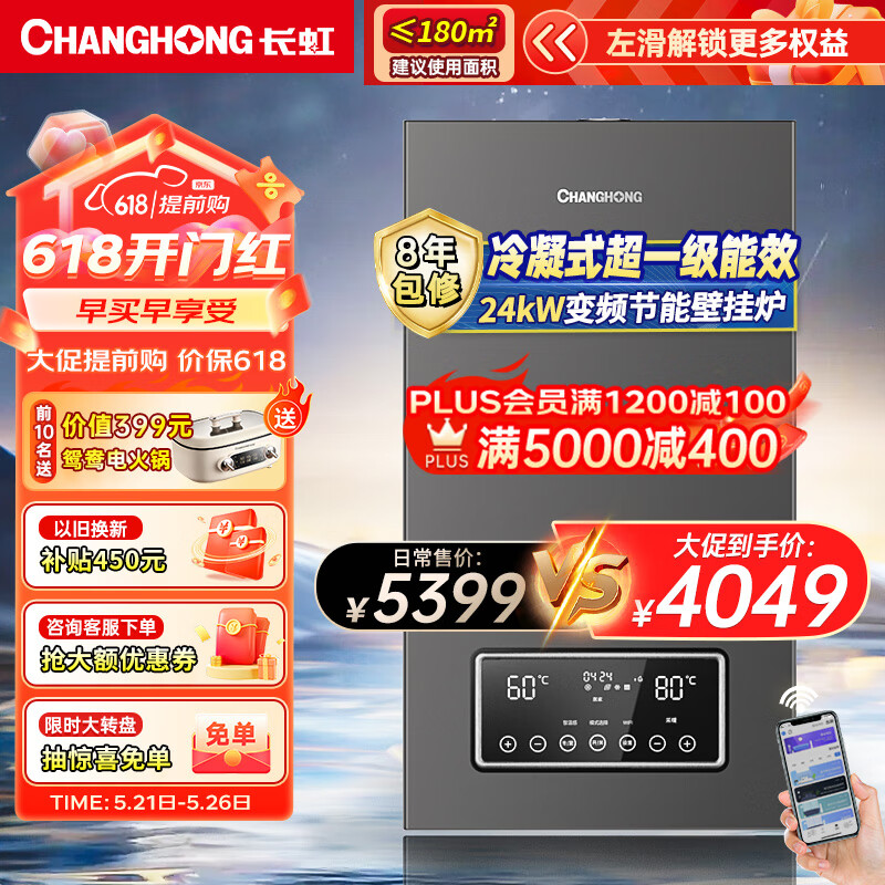 长虹(CHANGHONG)燃气壁挂炉家用供暖淋浴一级能效冷凝式节能省气APP智控暖气片地暖恒温LL1PBD24-C6价格:5399.00元!