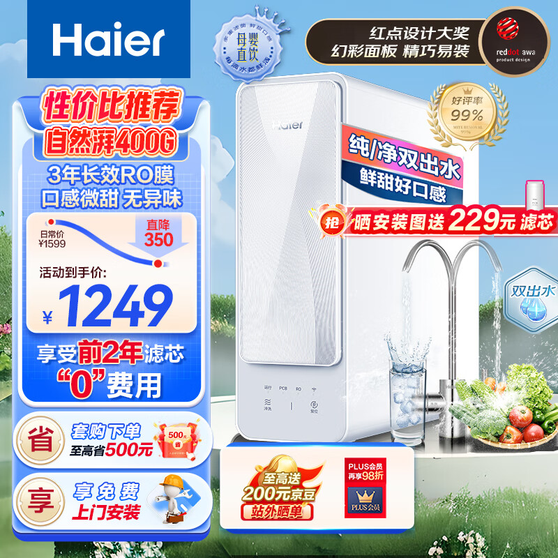 海尔(Haier)自然湃家用净水器400G净水机 RO反渗透过滤双出水厨下自来水过滤直饮纯水机 HRO4H88价格:1249.00元!
