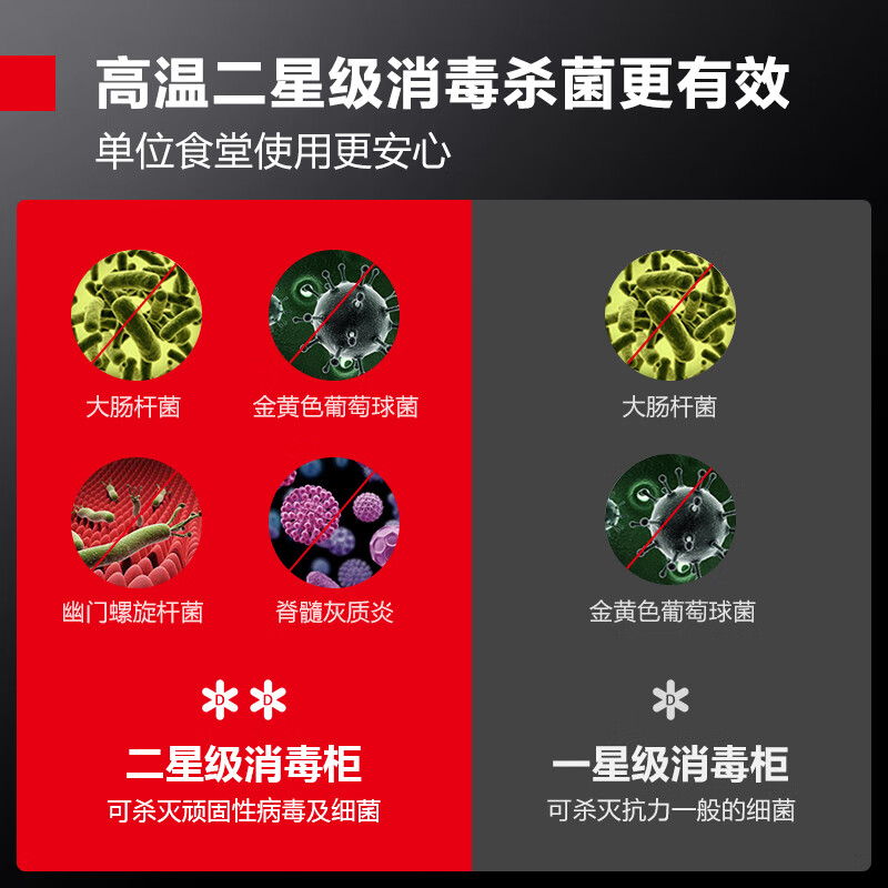 1、外形外观:简介,大方。黑色机身,金色把手产品质量:无噪音、一直信赖消毒效果:可以杀灭很多细菌。放心使用空间容量:食堂使用、超级大容量