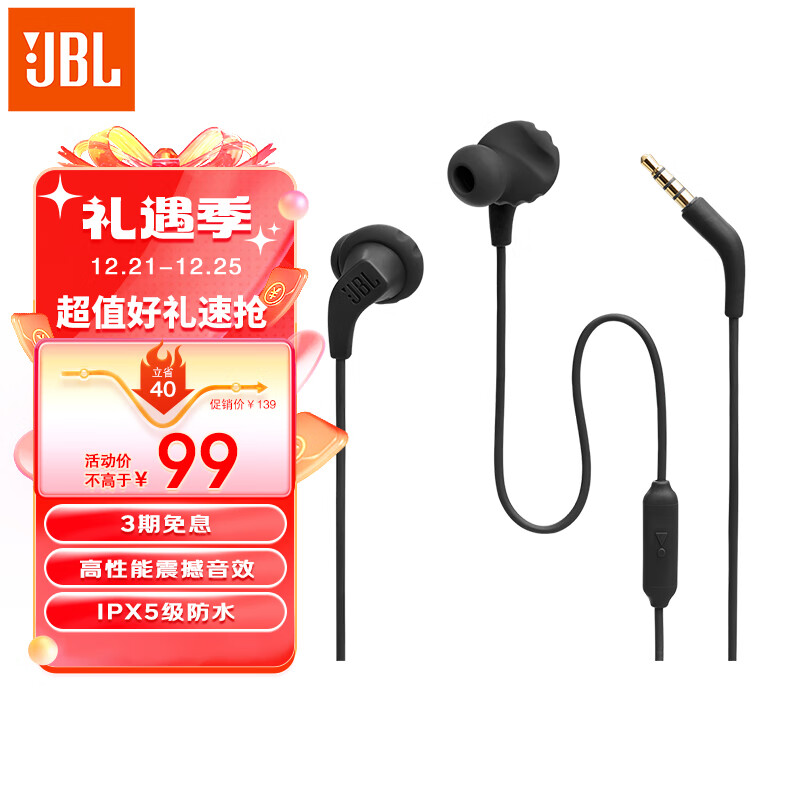JBL Run2 入耳式有线耳机 运动游戏电竞专用 3.5mm圆孔线控电脑笔记本手机适用 网课办公吃鸡K歌 黑色价格:99.00元!