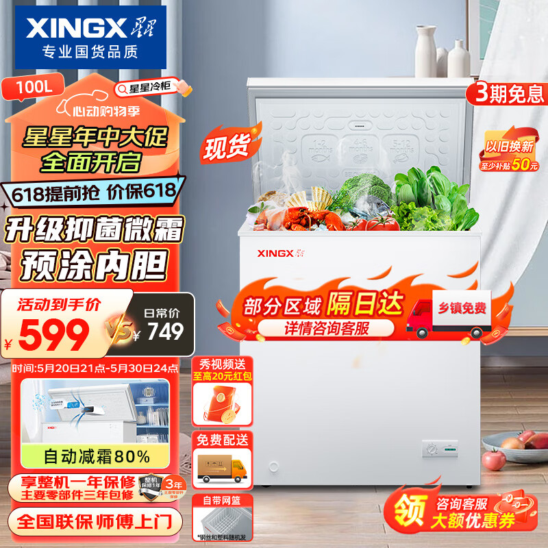 星星(XINGX)100升家用商用减霜净味冰柜 冷藏冷冻转换冷柜 节能顶开冰箱 BD/BC-100QJ价格:599.00元!