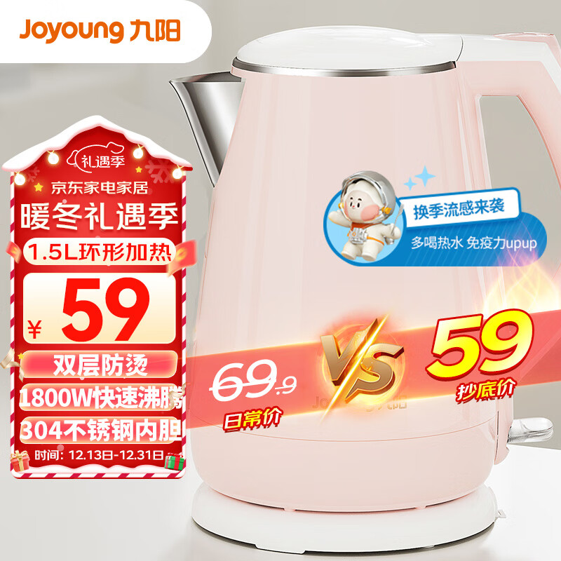 九阳(Joyoung)热水壶烧水壶电水壶 双层防烫304不锈钢 家用大容量电热水壶 K15-F626价格:59.00元!