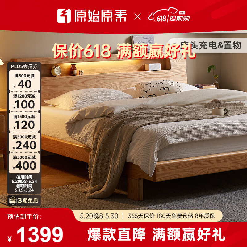原始原素实木床橡木夜光床现代简约双人床1.5米床低体床原木色双人床价格:2132.00元!