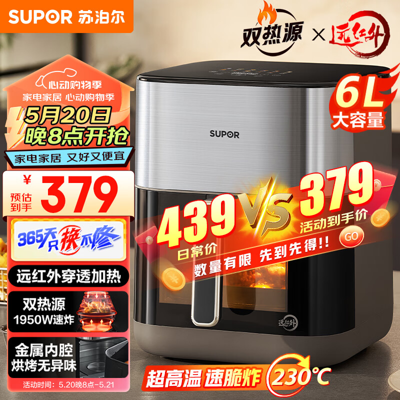 苏泊尔(SUPOR)空气炸锅 远红外穿透加热 家用6L大容量 不用翻面薯条机蒸汽嫩炸多功能电炸锅 KD60Y883价格:429.00元!