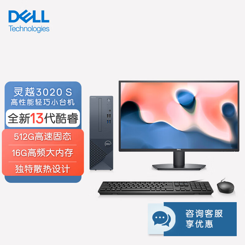 戴尔(Dell)灵越3020S 新款 台式电脑主机 高性能整机 台式机 商用办公电脑 教育学习 图形设计 (13代i5-13400 16G 512GSSD三年上门)27英寸大屏显示器价格:4099.00元!