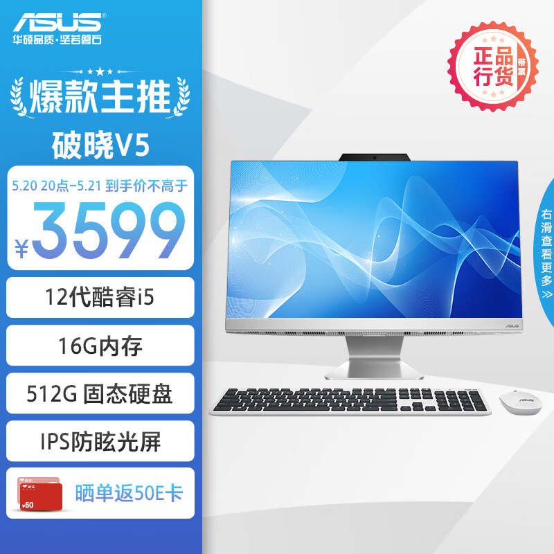 华硕破晓V5 23.8英寸家用商用一体机电脑台式电脑(12代i5-1235U 16G 512G固态 WIFI6蓝牙)白价格:3599.00元!