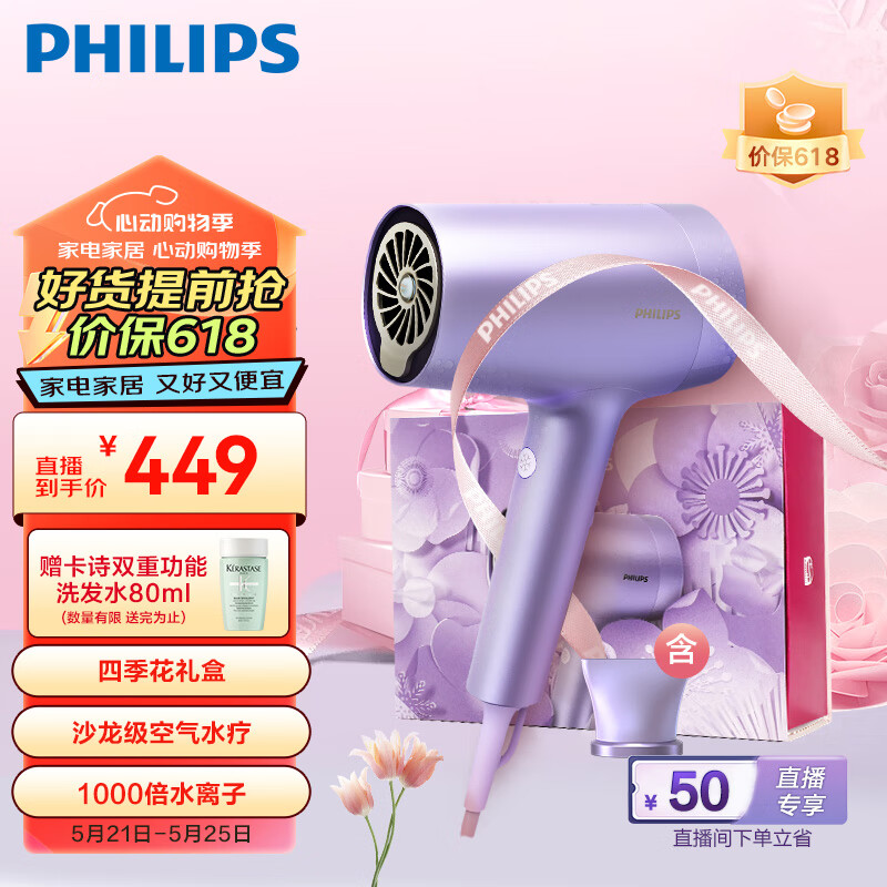 飞利浦(PHILIPS)电吹风机 7系pro 水光机礼盒款 2亿级负离子 1千倍水离子 绝绝紫水光机礼盒价格:499.00元!