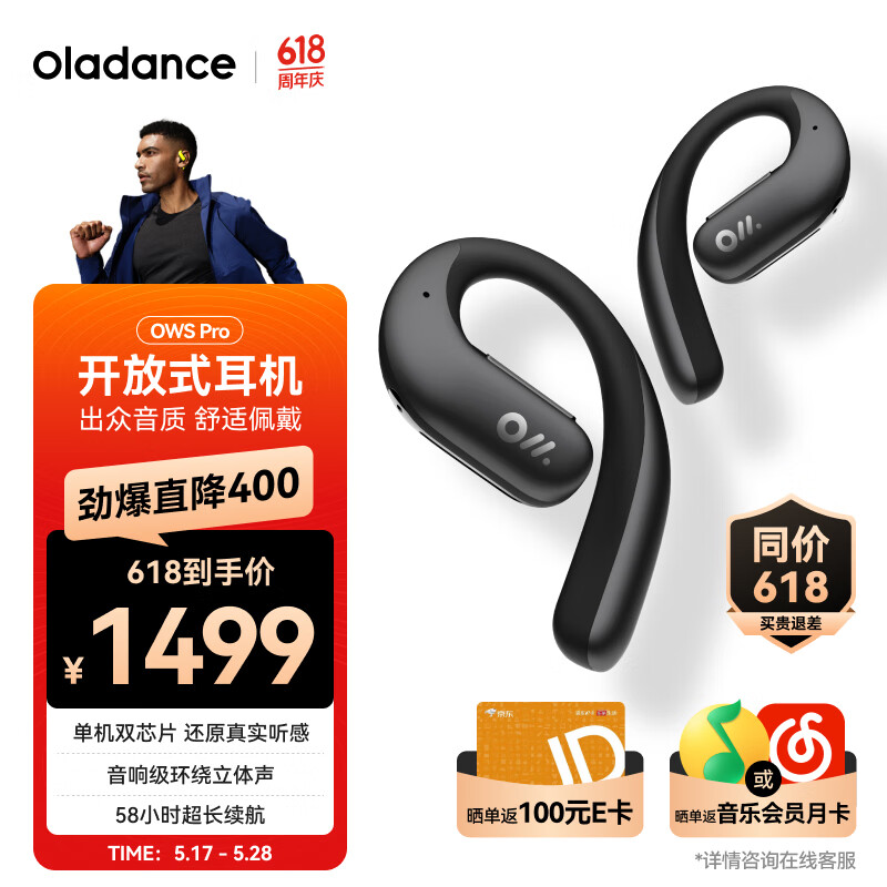 OladanceOWS Pro 全开放式耳机(含充电仓)无线蓝牙不入耳防漏音运动耳机超长续航【ola小月牙】 沉静雾黑价格:1499.00元!