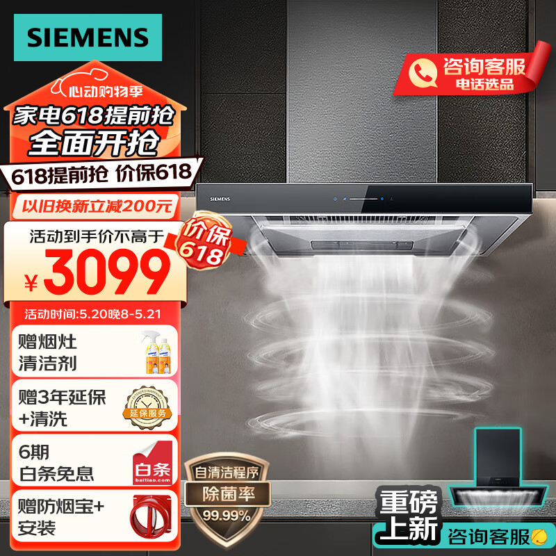 西门子(SIEMENS)欧式抽油烟机21.5m3/min顶吸家用吸抽烟机 5D立体环吸自清洁LC77UA951W以旧换新价格:3099.00元!