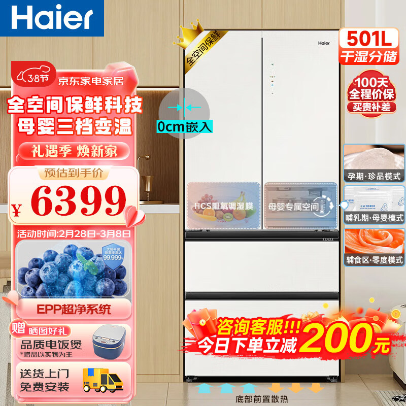 海尔(Haier)冰箱家用501升风冷变频多门冰箱全空间保鲜科技EPP超净系统纤薄零距离嵌入式BCD-501WGHFD14GXU1价格:6599.00元!