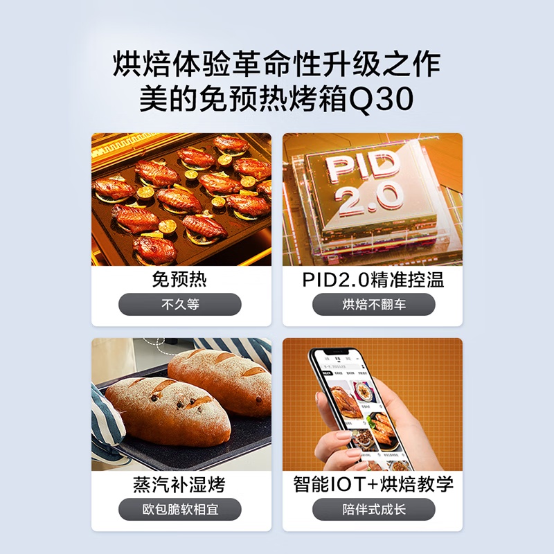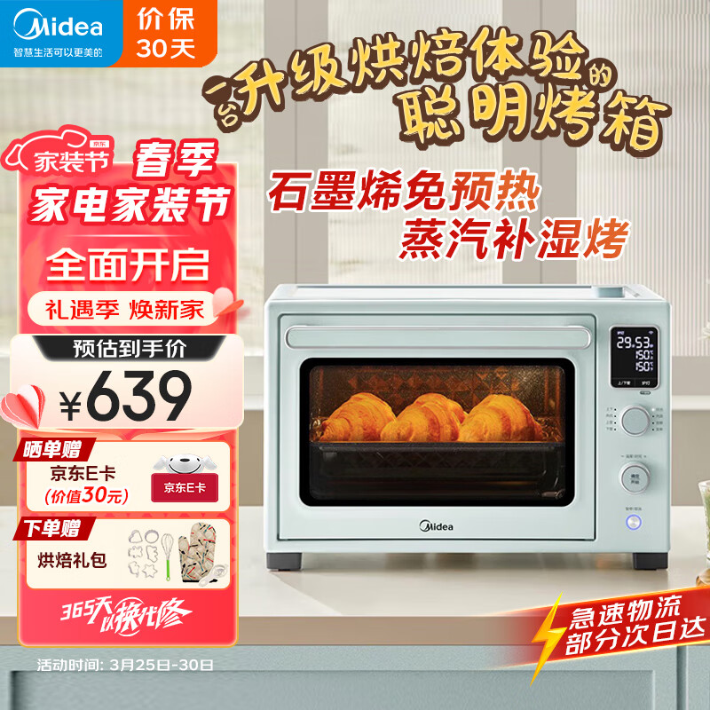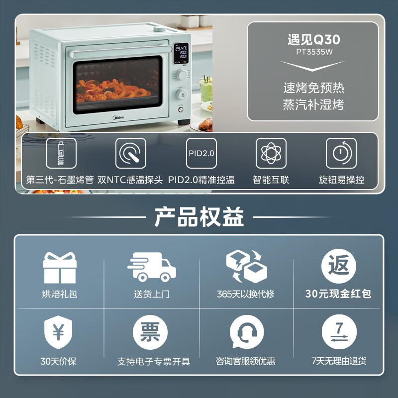 美的免预热电烤箱35L大容量家用 石墨烯烤箱初见Q30系列 精准控温 补湿嫩烤 搪瓷内胆 淡雅绿价格:659.00元!