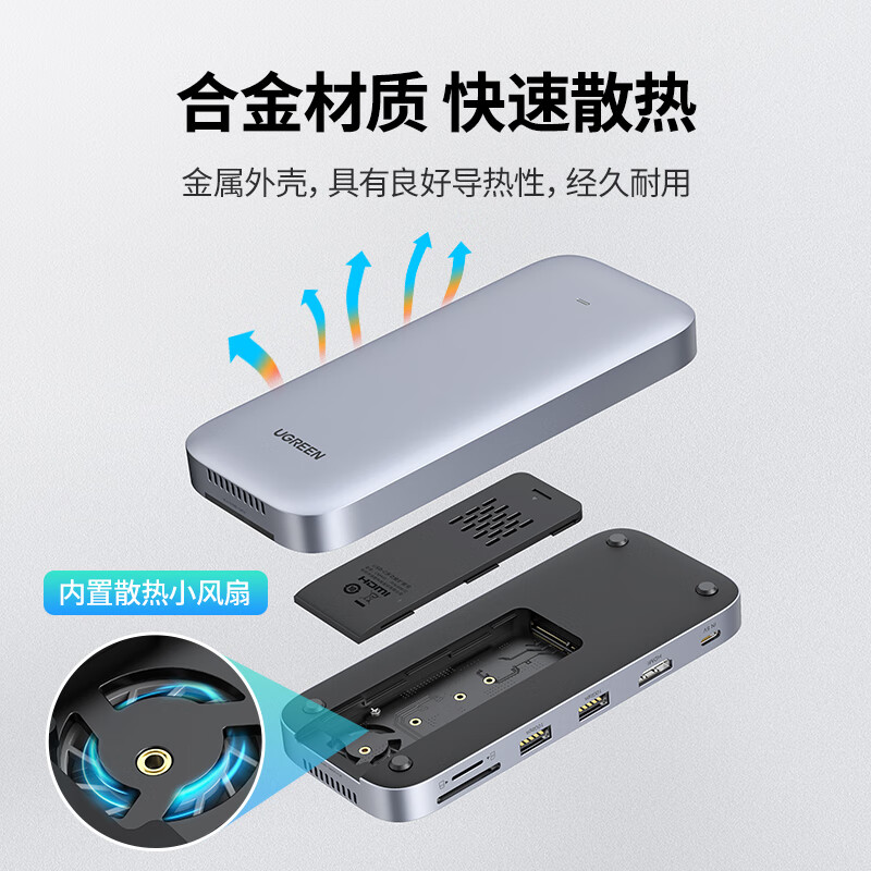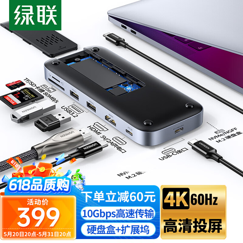 绿联Type-C移动硬盘盒M.2拓展坞NVMe/SATA固态双协议C转HDMI转接头4K60Hz 3.2分线器适用苹果15笔记本价格:399.00元!