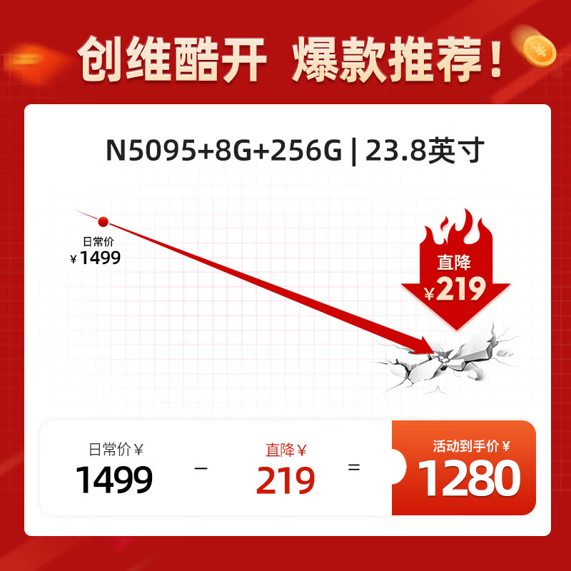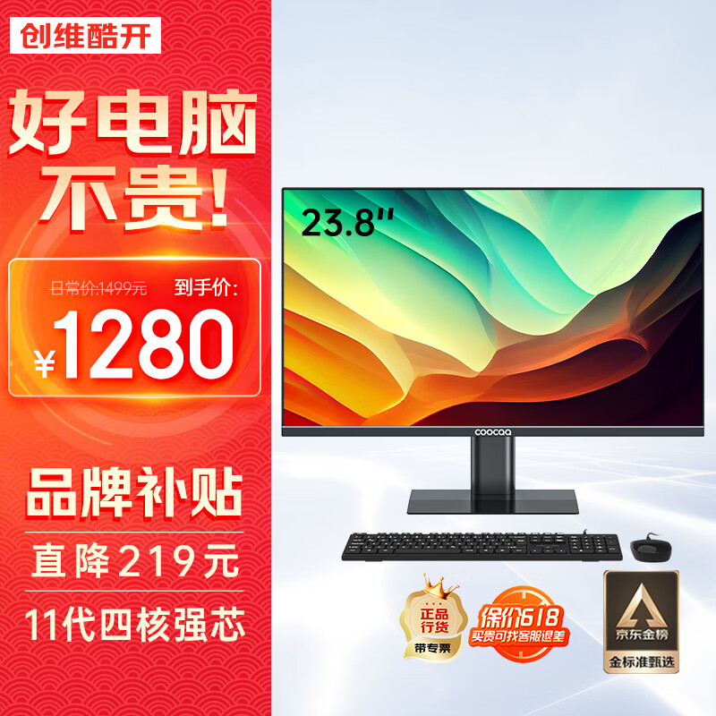 酷开 创维电脑 23.8英寸办公商用家用娱乐一体机台式电脑(11代N5095 8G 256G SSD 双频WiFi 蓝牙)价格:1280.00元!