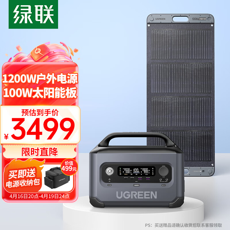 绿联(UGREEN) 星辰1200W户外电源套装 内含GS1200W户外电源+100W太阳能板 露营自驾家用应急备用电源价格:4298.00元!