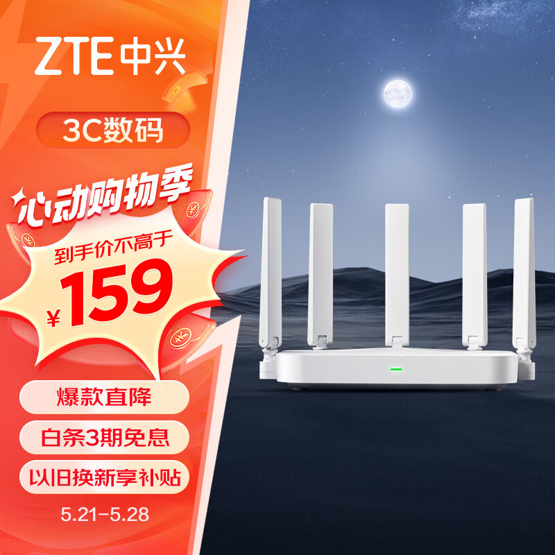 中兴(ZTE)巡天 AX3000满血WIFI6千兆无线路由器 自研双核主芯片 5G双频游戏路由 Mesh 3000M无线速率价格:159.00元!