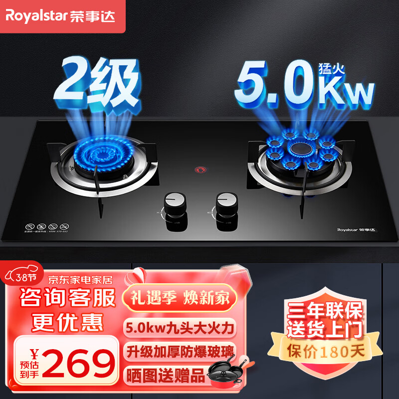 荣事达(Royalstar)燃气灶液化气双灶嵌入式家用5.0kw九头鸳鸯火力玻璃熄火保护管道气猛火灶具RSD-R206 液化气价格:269.00元!