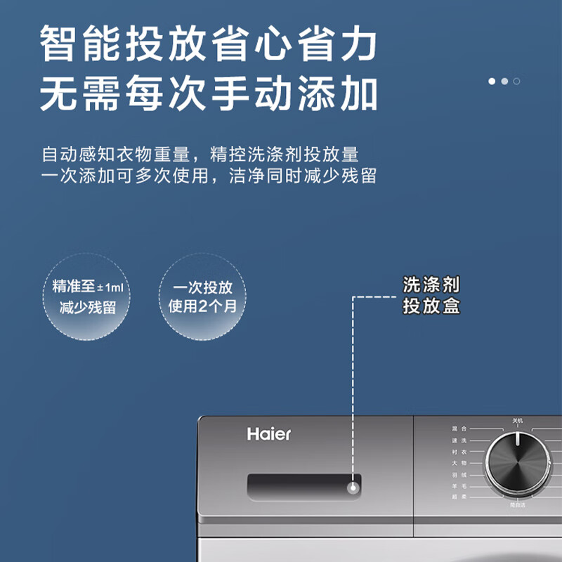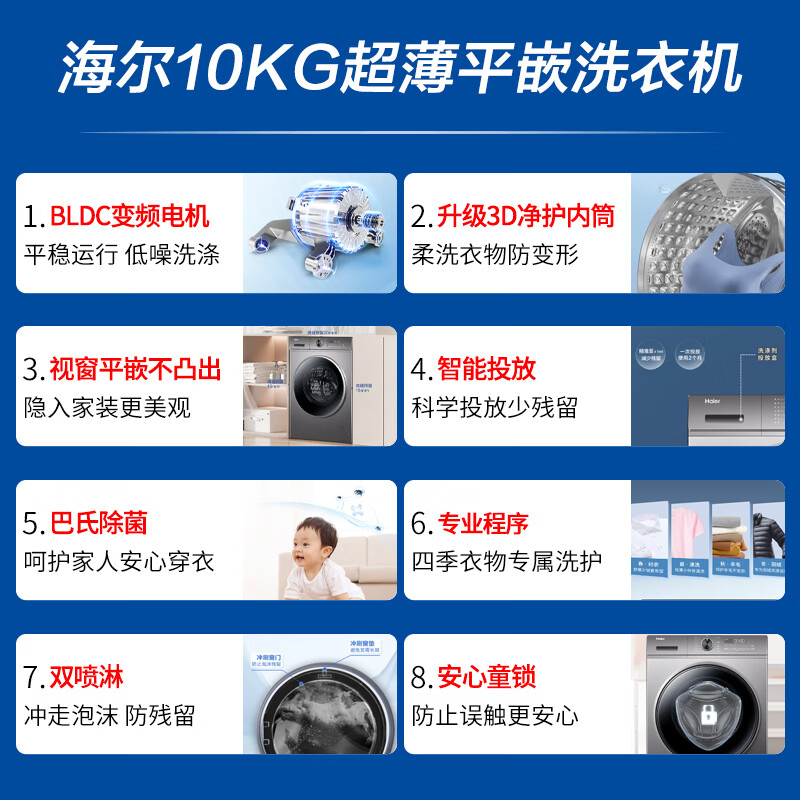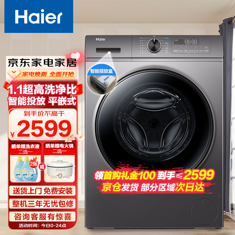 海尔(Haier)【1.1高洗净比】10KG全自动滚筒洗衣机变频一级能效超薄平嵌智能投放巴氏除菌XQG100-BD1216[家电]价格:2699.00元!