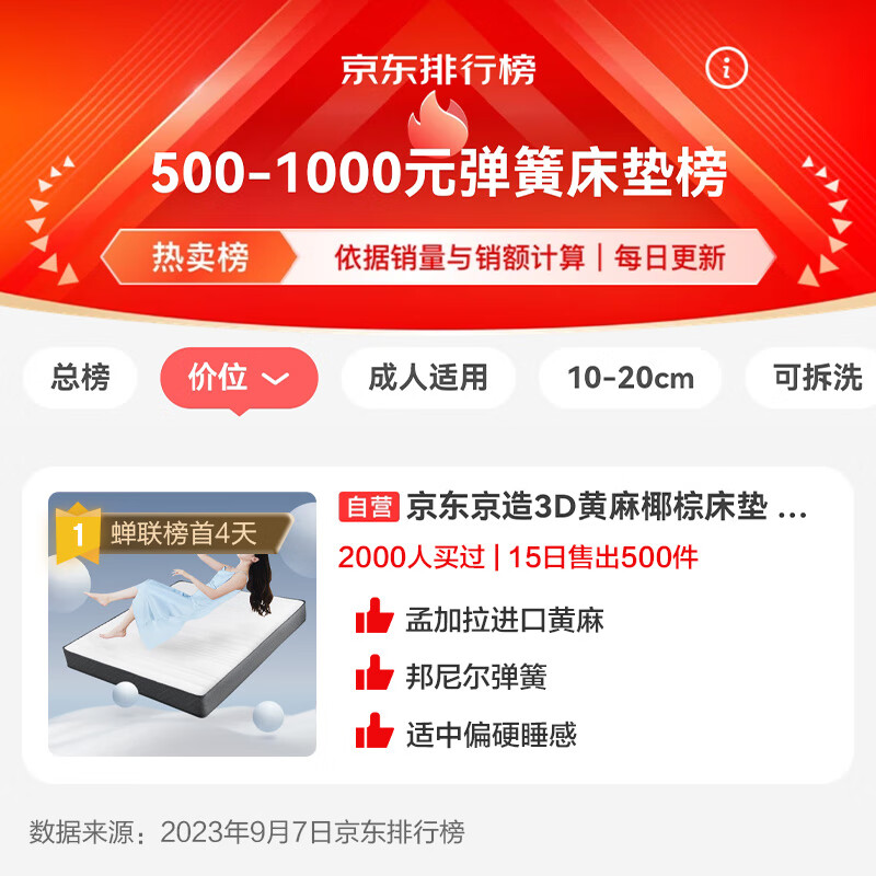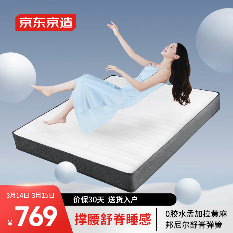 京东京造弹簧床垫 进口黄麻|邦尼尔弹簧|围边加固 席梦思床垫1.5×2米MH06价格:869.00元!